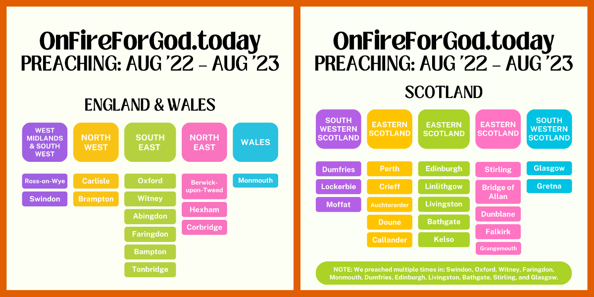 As you can see from the above colorful image of our preaching locations since last August, we’ve been about our Father’s business this past year, preaching in England, Wales and Scotland. In these locations, and in many others, we’ve also done much one-to-one evangelism work, as well as ministering to folk we meet on the streets, in shops, and in our daily walk through life, including stopping to minister to many homeless folk. All this in addition to leading twice-weekly (2 to 4-hour) fellowship and Bible study meetings, and day-to-day ministering to folk from around the world.